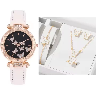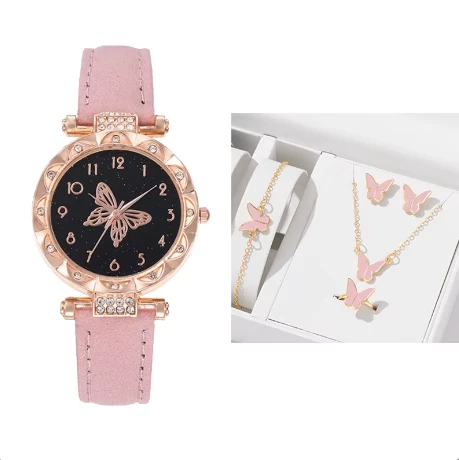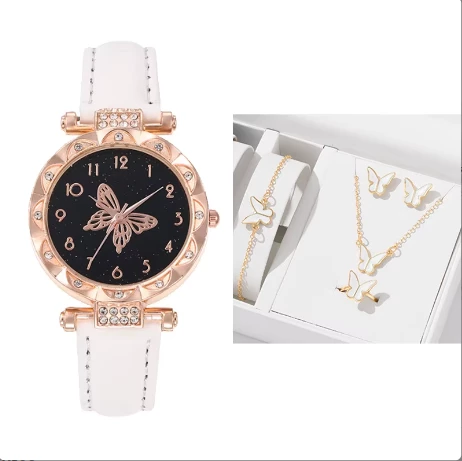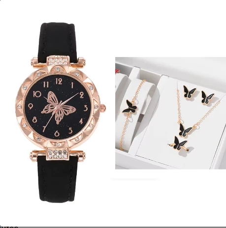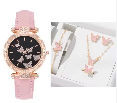 5PCS/Set Women Watch With Bracelet Necklace Earrings And Rings Set Butterfly Leather Strap Watch Jewelry For Women AM2480002